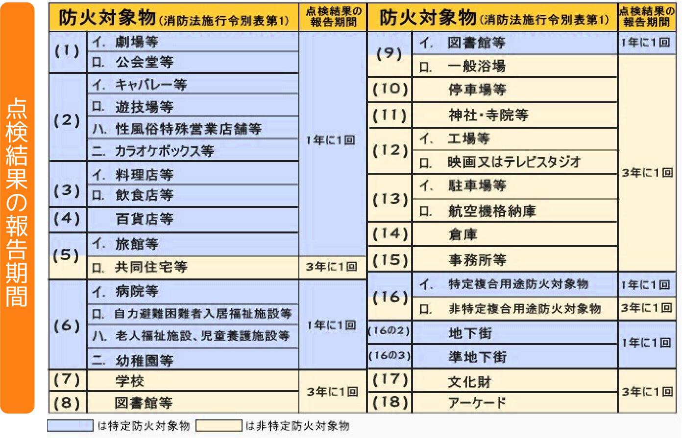消防法第17条に基づき、消防用設備などの設置が義務づけられている防火対象物の関係者(所有者・管理者・占有者)は、その設置された消防用設備などを定期的に点検して、その結果を消防庁または消防署長に報告する義務があります。